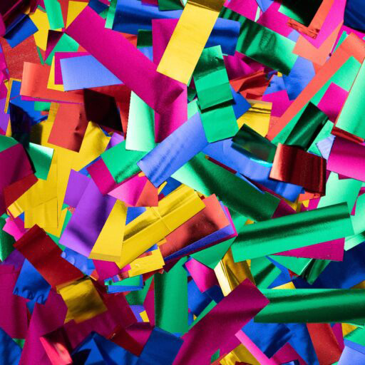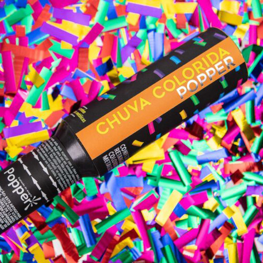 Quando acionado, lança uma chuva de confetes metalizados coloridos, com alcance de até 8 metros de altura.