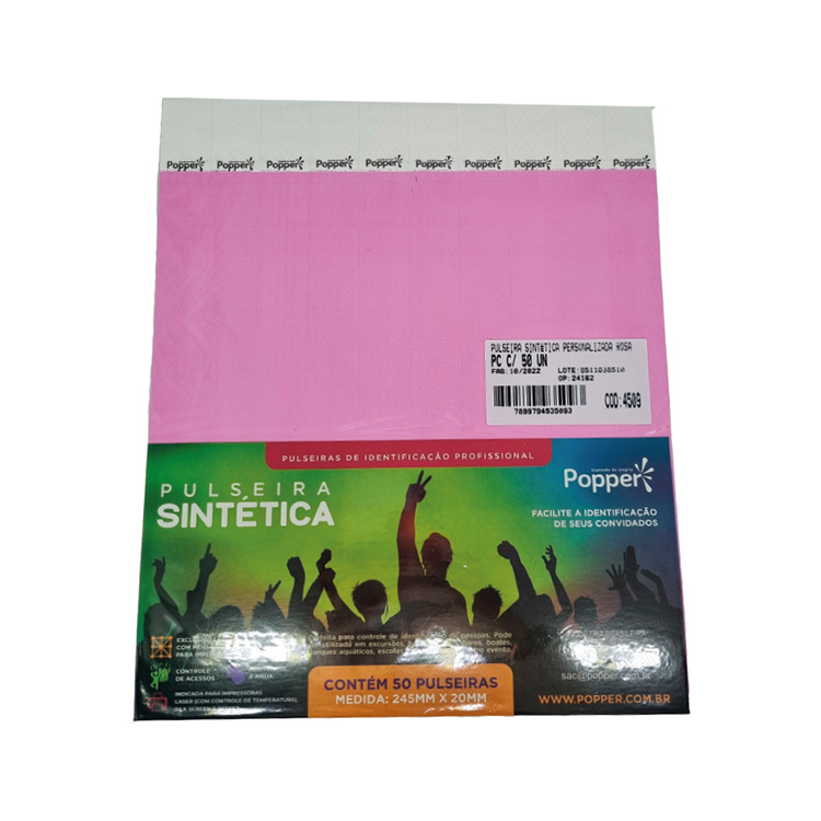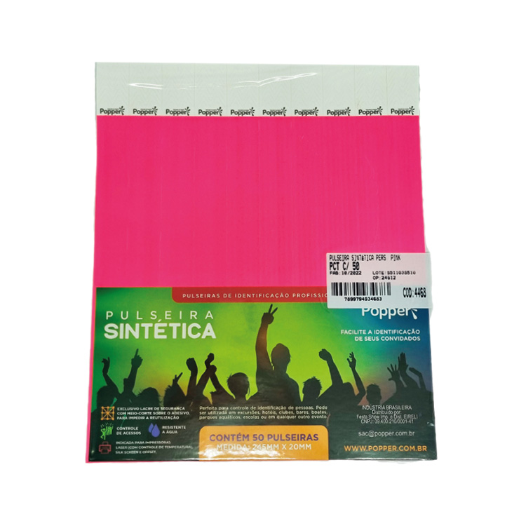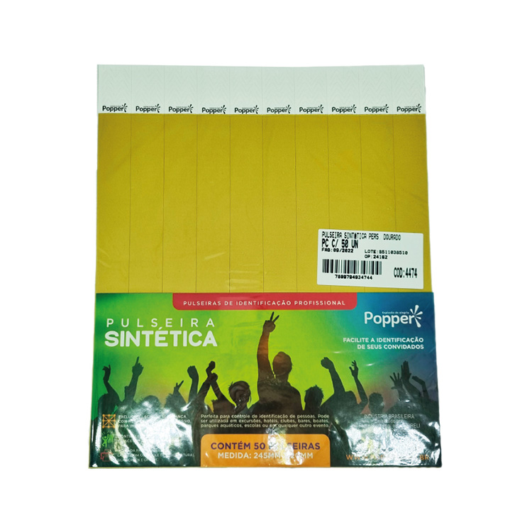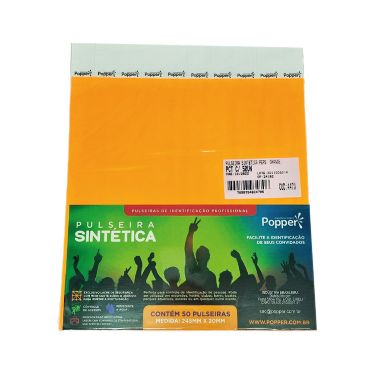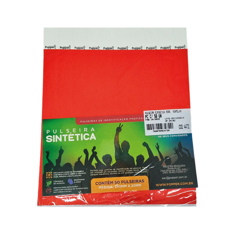 Com lacre adesivo, ajustável ao pulso e resistente à água.