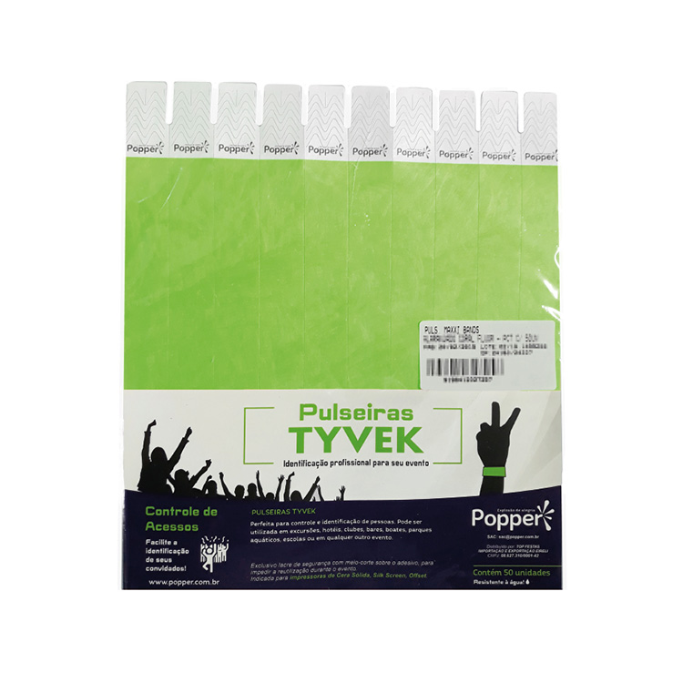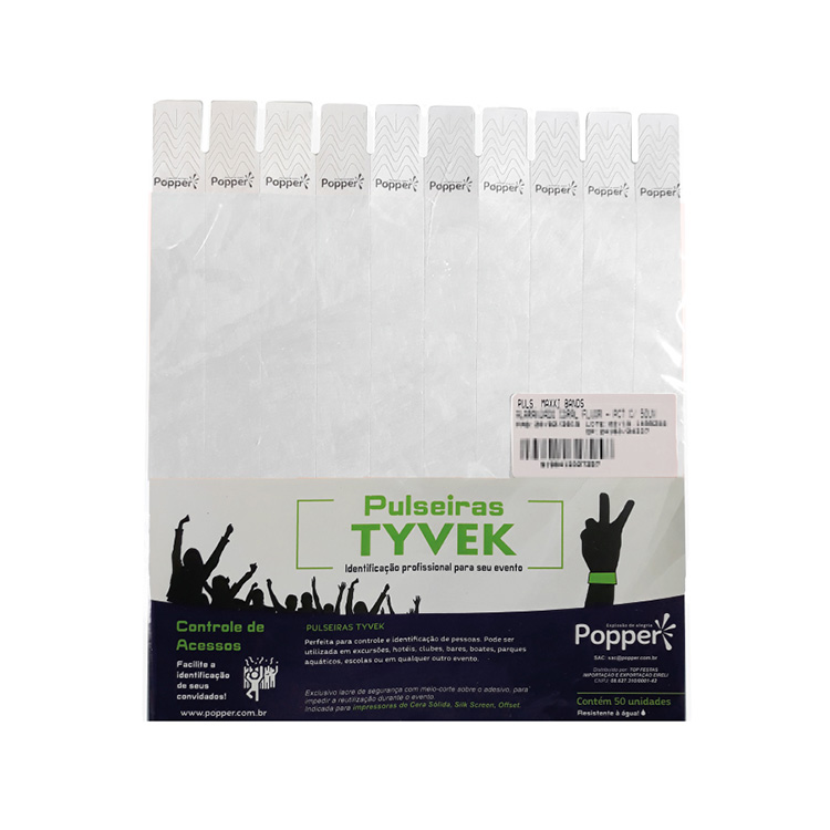 Com lacre adesivo, ajustável ao pulso e resistente à água.