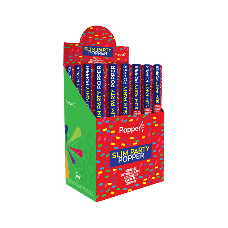 O lança confetes Slim Party Popper é feito com confetes retangulares, coloridos e papel crepom. Seu diâmetro “slim” é compacto e garante mais praticidade no manuseio, além de facilitar o armazenamento e a exposição do produto.