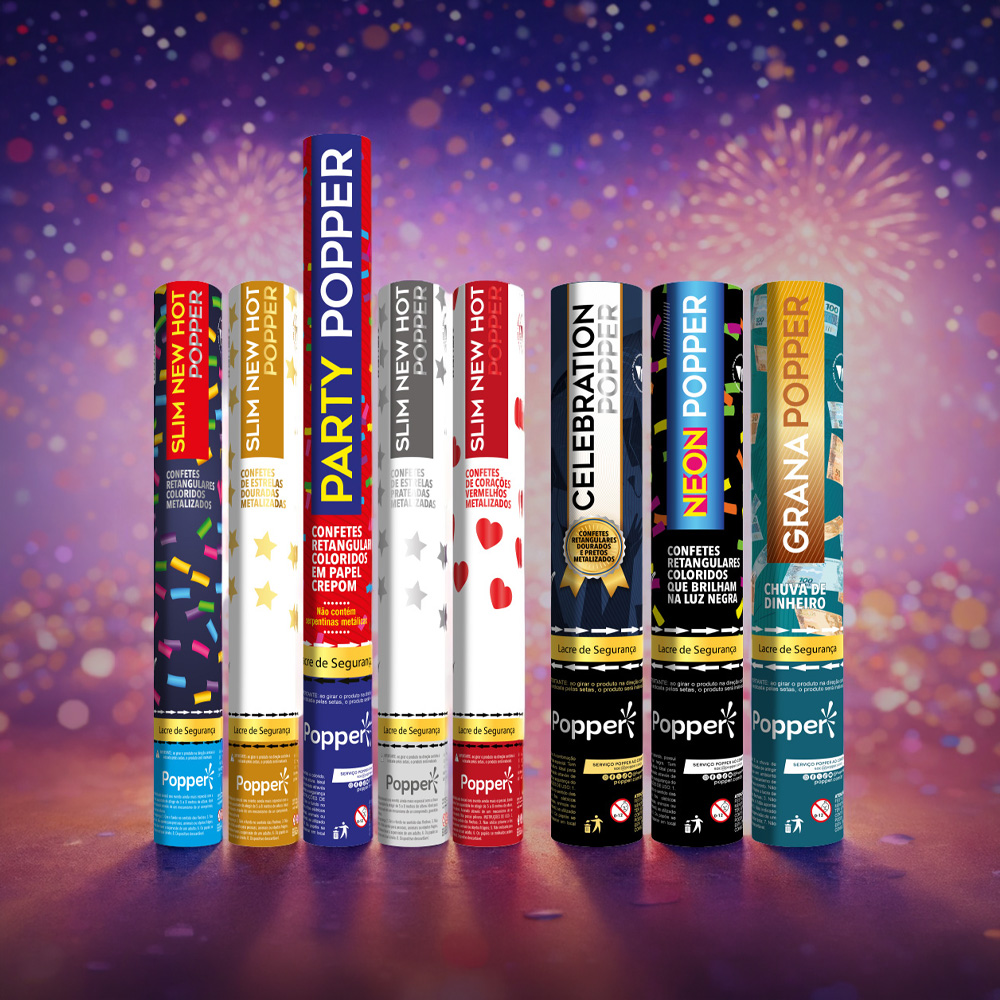 - O que muda: os lança confetes Popper de 40 cm (Celebration, Neon e Grana Popper) ganham versões de 30 cm.