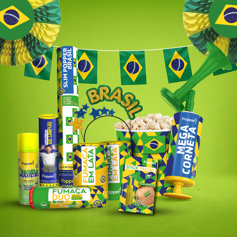 Jogo de futebol é um sinal claro de que terá muito barulho e, é claro, torcemos para que seja de comemoração. E para que a torcida fique completa e comemore à altura, a Popper reuniu em seu portfólio produtos que tem a cara da torcida brasileira, que ama uma festa.