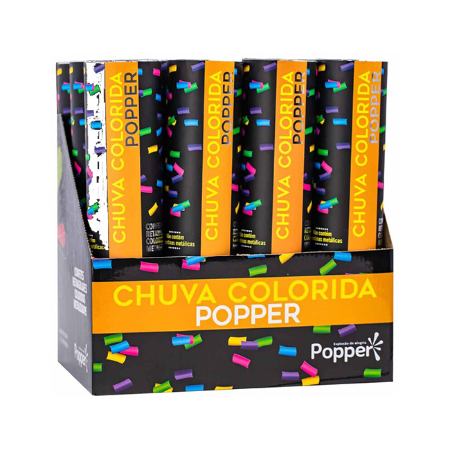 Quando acionado, lança uma chuva de confetes metalizados coloridos, com alcance de até 8 metros de altura.