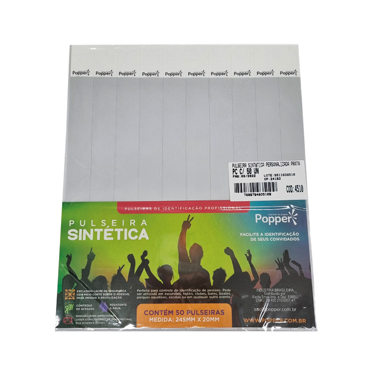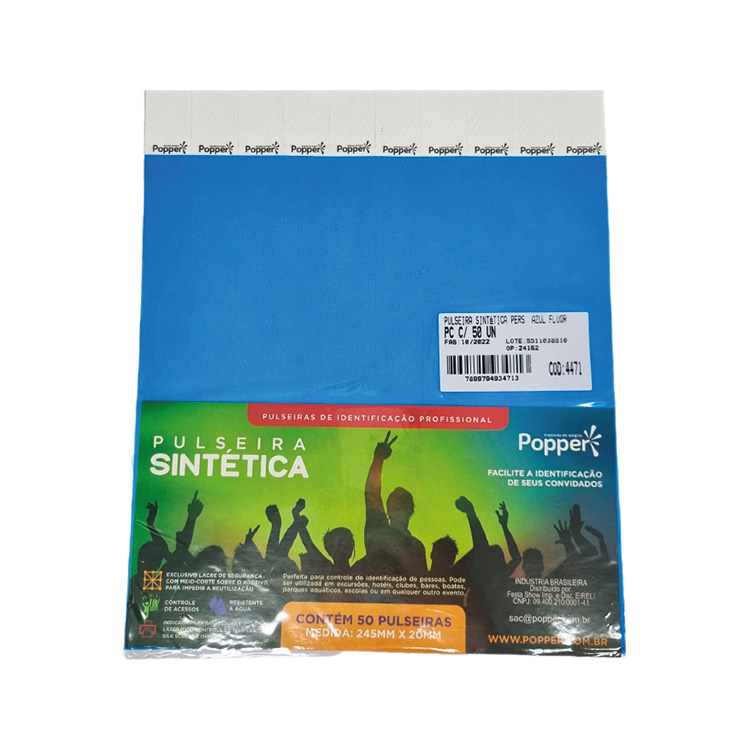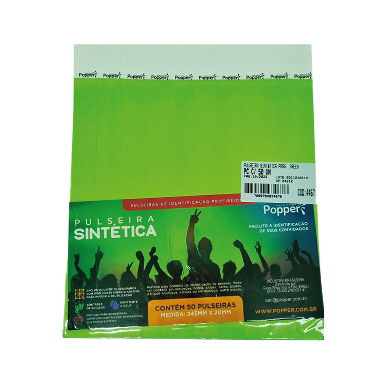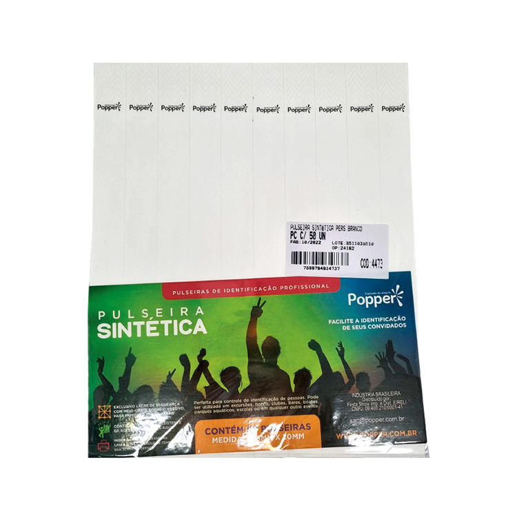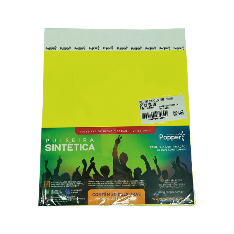 Com lacre adesivo, ajustável ao pulso e resistente à água.