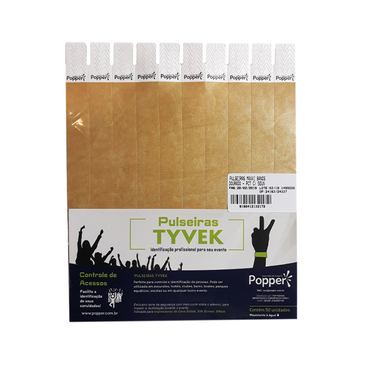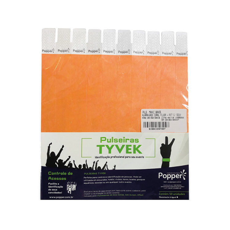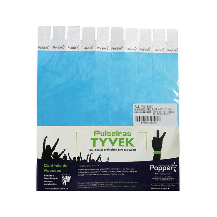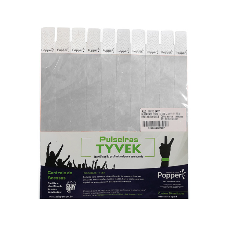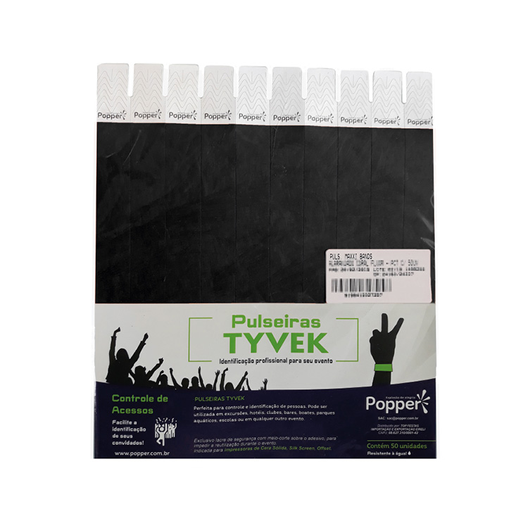 Com lacre adesivo, ajustável ao pulso e resistente à água.